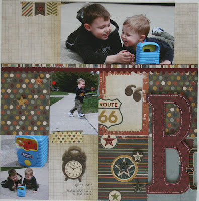 This first page is based upon the sketch challenge for the month of April, that Jillibean Soup hosts on their blog each month. I tried to copy and paste the sketch here for you to see, but for some reason, I couldn't get it to format properly. If you are interested in the original sketch, however, click here for the original blog post about it. I used up lots of Spotted Owl Soup goodies on this page. I don't think the color scheme of this birthday themed line, could have been any more perfect for the pictures of my birthday boy, don't you agree?